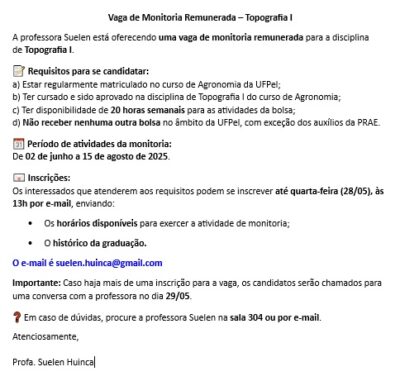 Seleção para Monitoria Voluntária (SEM BOLSA) para a disciplina Topografia II (01190009), para o semestre 2025/2. A monitoria voluntária será regida pelo edital 26/2025 da Pró-Reitoria de Ensino (https://wp.ufpel.edu.br/pre/files/2025/09/SEI_3283929_Edital_26.pdf) e pela resolução 32/2018 do Conselho Coordenador do Ensino, da Pesquisa e da Extensão da UFPel (https://wp.ufpel.edu.br/scs/files/2018/10/SEI_UFPel-0312781-Resolu%C3%A7%C3%A3o-32.2018.pdf). Interessados na seleção entrar em contato com o professor Rodrigo Rizzi pelo e-mail drrizzi@gmail.com até 08/10/2025.