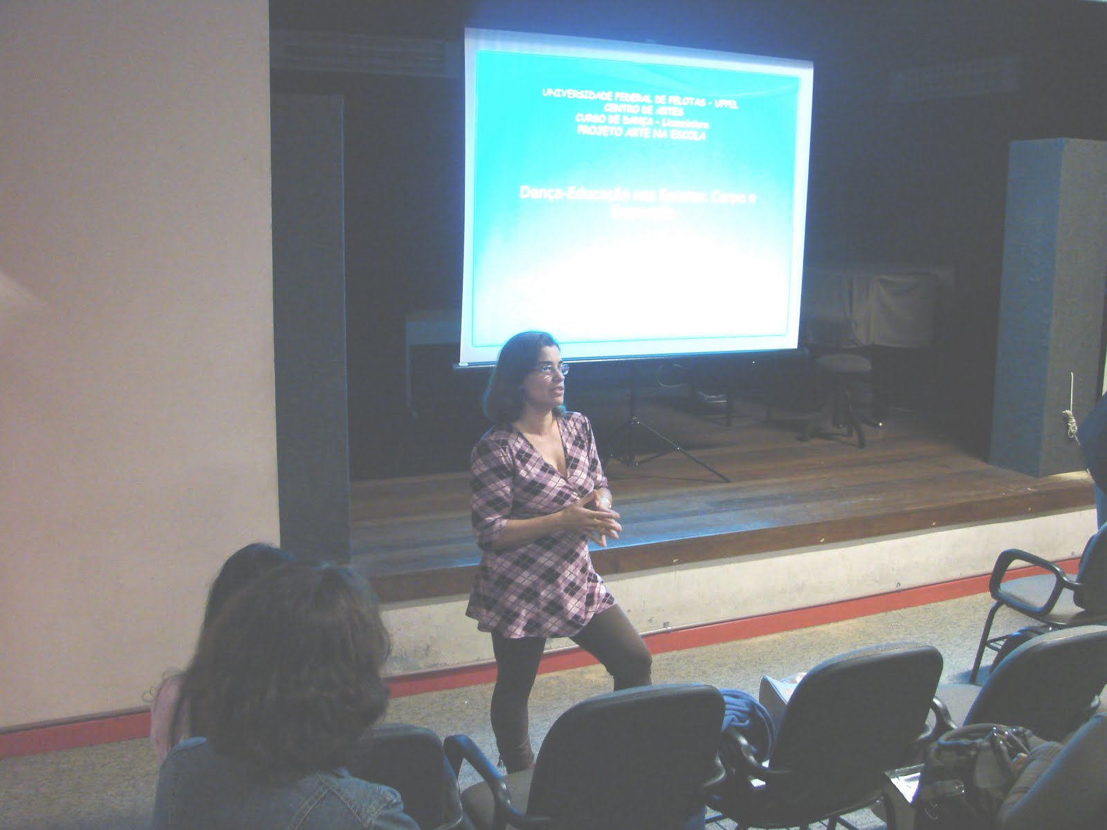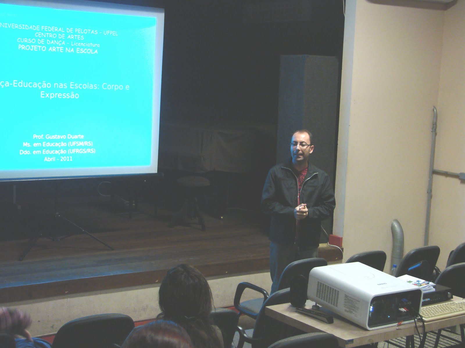 No dia 27 de abril iniciou o Ciclo de Debates “A Arte e seus territórios”, promovido pelo Projeto Arte na Escola, Pólo UFPEL. O palestrante foi o prof. Gustavo Duarte que falou sobre “Dança-educação nas escolas: corpo e expressão” e procurou contextualizar o ensino da dança no espaço escolar como uma linguagem artístico-educativa. A realidade da dança nas escolas atualmente e a formação de professores em artes foram alguns tópicos abordados. A aposta em uma formação permanente, o trabalho integrado entre as linguagens artísticas e uma maior aproximação entre universidade-escola foram alguns caminhos apontados.