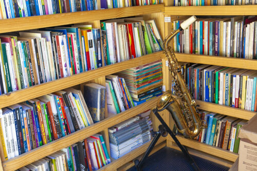 Acervo é disponível para empréstimo durante sua estada no município e sax está a postos para shows