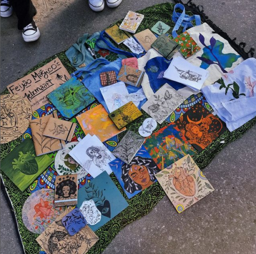 Entre os artigos comercializados pela Feijão Mágico, destacam-se os panos de prato, os bloquinhos e cadernos, além das ilustrações de Melissa. A artista explica que os produtos vendidos são essenciais para a sua subsistência e manutenção na faculdade. “É importante porque qualquer coisa que venda já é uma passagem para Pelotas, outro produto que venda já é tipo o RU da semana toda”, exemplifica Mel.