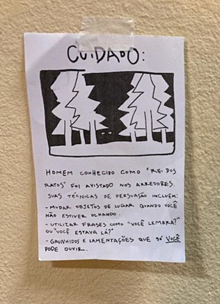 Clara espalha misteriosos e absurdos bilhetes nos corredores dos prédios da Universidade. Ela busca explorar a autoridade que damos para avisos, símbolos e panfletos. “Eu queria brincar com a realidade que alguém entenderia ao ler uma mensagem que, pelo jeito que se dispõe, deveria ser séria, mas que acaba sendo algo fantasioso”, explica.