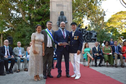 Klécio Santos recebe condecoração entregue pelo prefeito Fábio Branco e chanceler da Ordem de Silva Paes, Lauro Barcellos