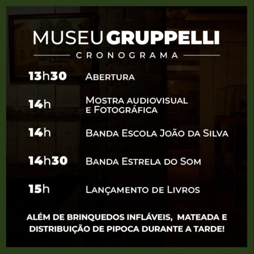 O Museu Gruppelli, localizado na Colônia Maciel, sétimo distrito de Pelotas, retoma suas atividades no domingo, dia 10 de novembro, a partir das 13h30min, após passar por reformas internas e externas. A programação de reabertura conta com apresentações musicais, lançamento de livros, mostra fotográfica e audiovisual, distribuição de pipoca, brinquedos infláveis gratuitos, exposição de flores, mateada, exposição de joias e outras programações.