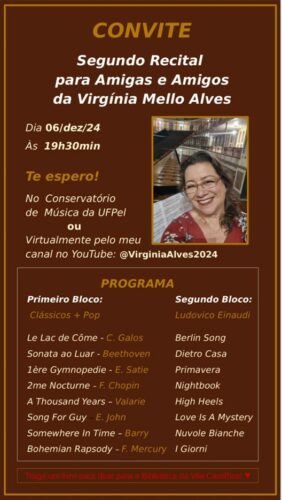 Com o fim da pandemia, Virgínia passou a realizar recitais. E, nesta sexta-feira, dia 6 de dezembro, a pianista apresenta o “II Recital de Piano para Amigas e Amigos”, às 19h30, no auditório do Conservatório de Música da UFPel na (Rua Félix Xavier da Cunha, 651, no Centro de Pelotas). O recital é um momento de troca, afeto e momentos de sensibilização, de uma artista da música amadora que toca, sabe tocar e ama o que toca. O evento é aberto, livre para todo o público, com entrada franca.