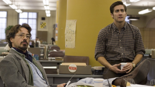 Jornalistas Paul Avery (Robert Downey Jr.) e Robert Graysmith (Jake Gyllenhaal) investigam assassino autor de cartas Foto; Divulgação
