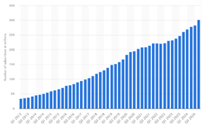 Ao contrário das telonas, os serviços de streaming, como a Netflix, nunca pararam de ter seus números de assinantes subindo a cada ano, chegando a mais 300 milhões em 2024, como vemos no gráfico de assinantes ao lado retirado do site Statista.