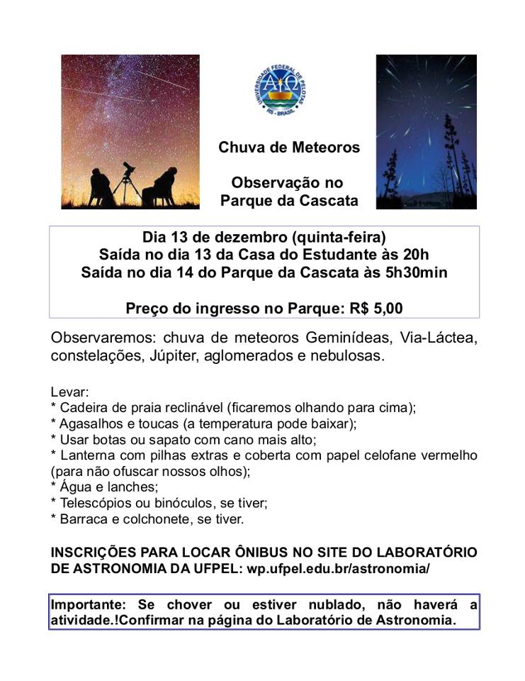 Opções de Transportes Pelotas/Parque Nova Cascata para a observação hoje, da chuva de meteoros: