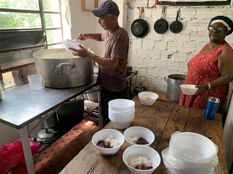 Claudete Lessa além de dirigir e coordenar a cozinha da ação, luta pelos direitos das pessoas, “o importante pra mim é fazer comida, que é o que eu gosto, minha profissão é fazer comida, isso aqui pra mim caiu de mão aberta, fazer comida pro povo”, ela comenta. Sua maior motivação é alimentar quem precisa e estar perto de seu filho, Giovani, que faz parte da organização do quilombo e também é morador.