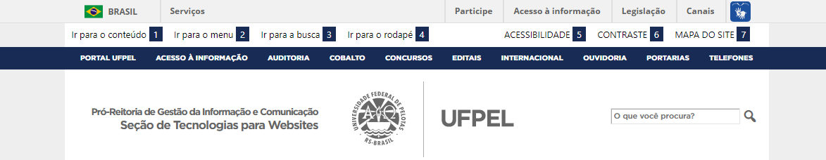 A nova barra de acessibilidade, incorporada ao cabeçalho dos sites que utilizam o tema UFPel 2.0, atende às diretrizes do Modelo de Acessibilidade em Governo Eletrônico (eMAG), do Governo Brasileiro. Na barra encontram-se atalhos de teclado que proporcionam acesso rápido às principais áreas do site, através das teclas Alt + número (navegadores Chrome e Edge) ou Alt + Shift + número (Firefox).