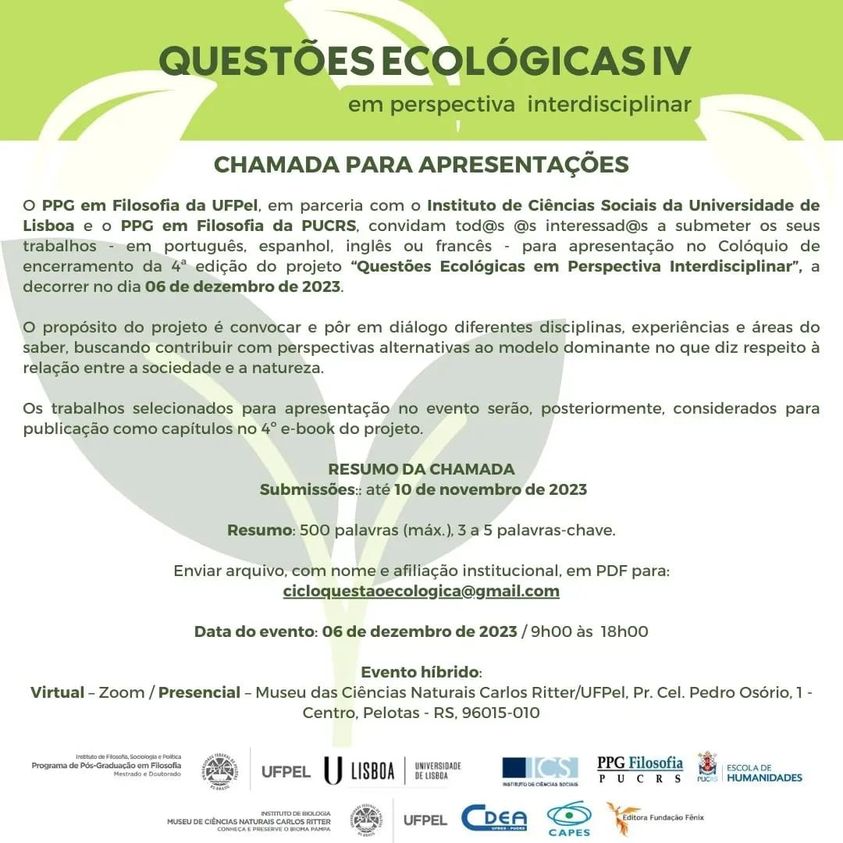 O PPG em Filosofia da UFPel, em parceria com o Instituto de Ciências Sociais da Universidade de Lisboa e o PPG em Filosofia da PUCRS, convidam tod@s s interessad@s a submeter os seus trabalhos – em português, espanhol, inglês ou francês – para apresentação no Colóquio de encerramento da 4ª edição do projeto Questões Ecológicas em Perspectiva Interdisciplinar, a decorrer no dia 06 de dezembro de 2023.