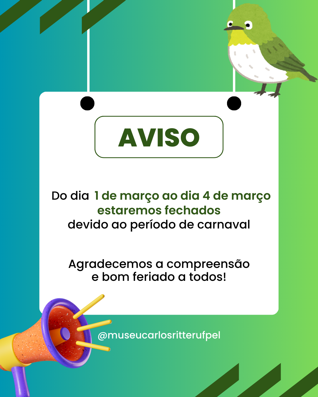 Descrição da imagem: Card nas cores verde e branco com a seguinte frase “quais são suas memórias com o museu Carlos Ritter?“