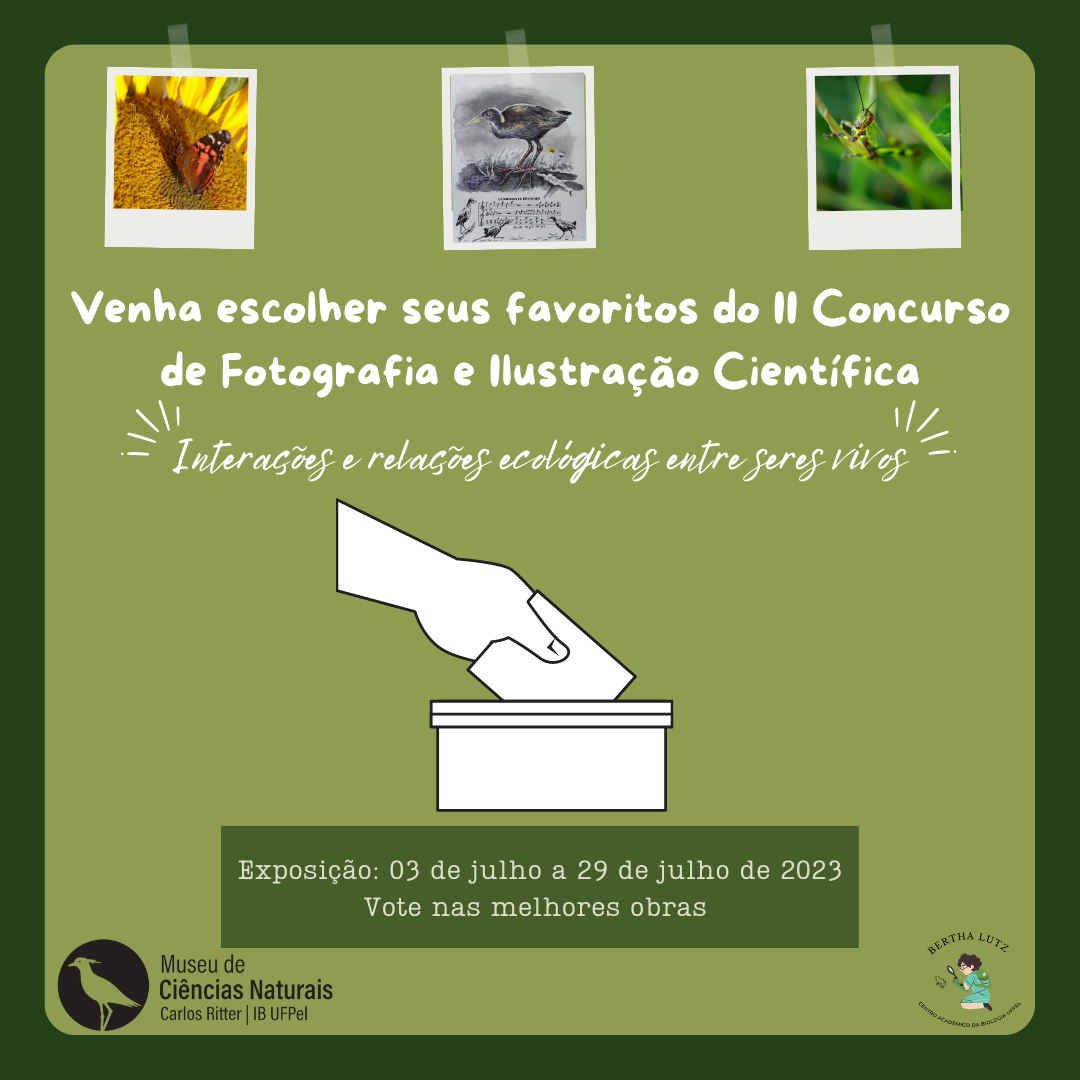 O Centro Acadêmico de Biologia em parceria com o Museu de Ciências Naturais Carlos Ritter tem o prazer de convidar a todos para visitar a exposição do II Concurso de Fotografia e Ilustração Científica. Este ano, o tema escolhido é “Interações e Relações Ecológicas entre Seres Vivos”.