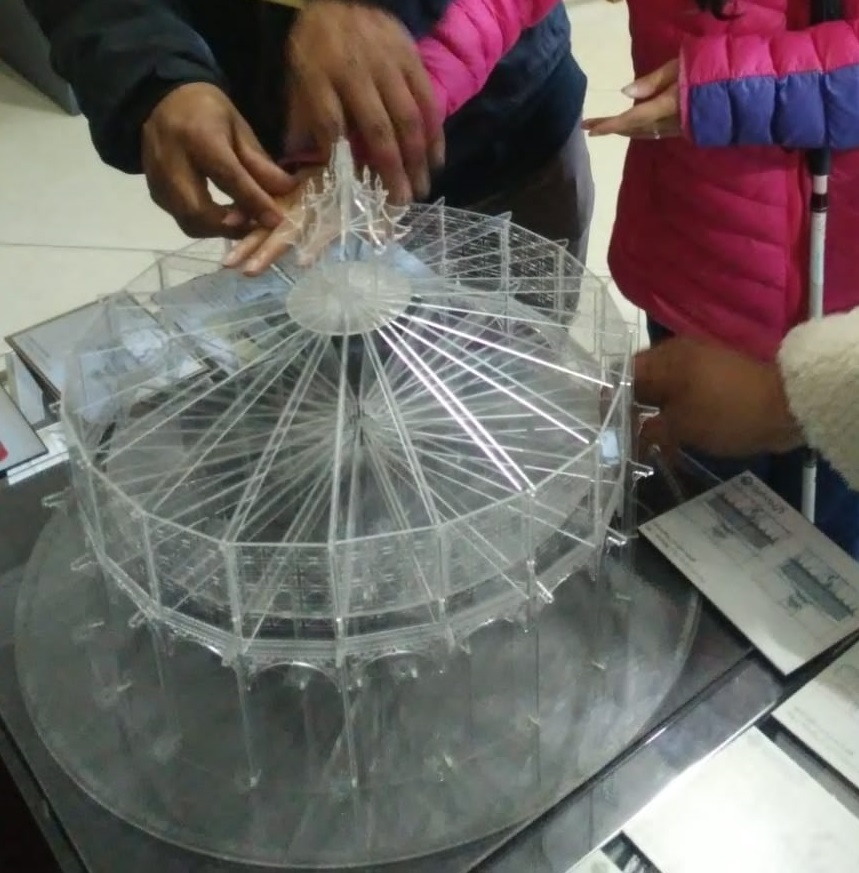 A foto acima mostra o trabalho executado pelos mediadores do MCNCR com as pessoas que possuem baixa visão.