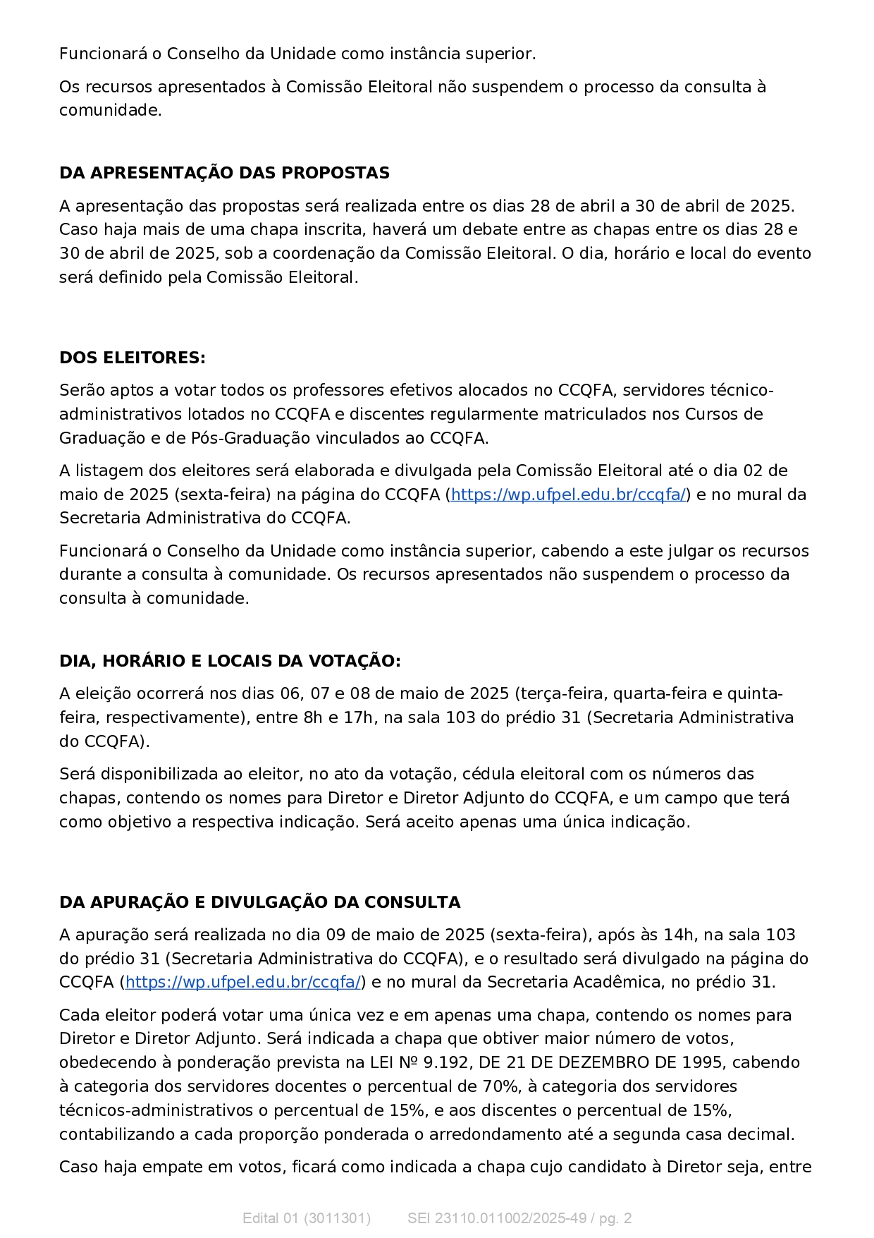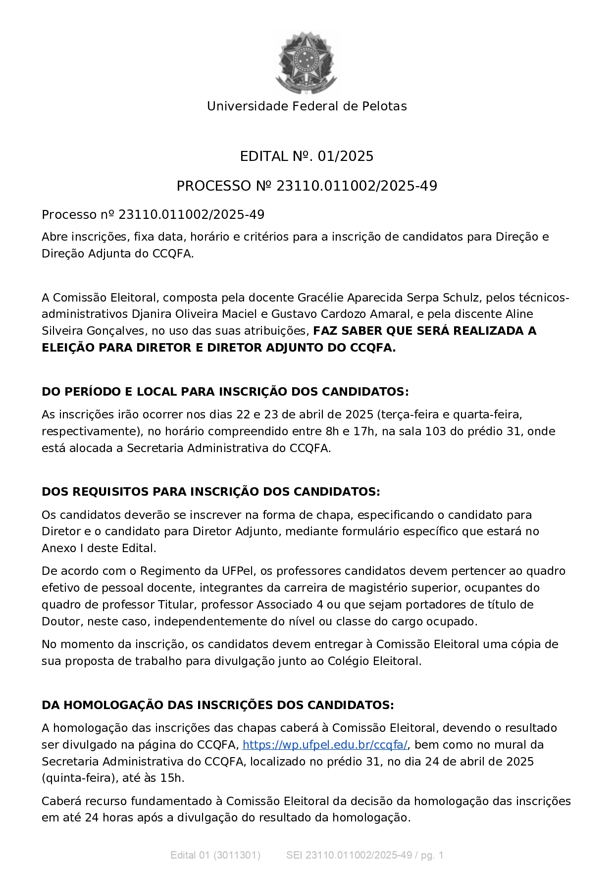 Edital para Eleição da Direção e Direção Adjunta do Centro de Ciências Químicas, Farmacêuticas e de Alimentos Publicado em 11/04/2025, na categoria Sem categoria.