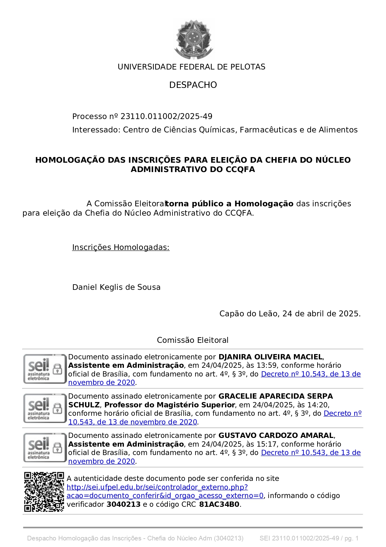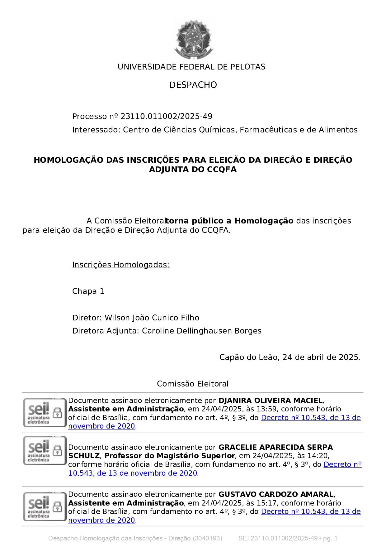 O Centro de Ciências Químicas, Farmacêuticas e de Alimentos (CCQFA) da Universidade Federal de Pelotas (UFPel) está com processo seletivo aberto destinado a vaga de professor substituto na Área de Química Analítica (1 vaga). Ressalta-se que as inscrições ocorrerão no período compreendido entre as 08 horas do dia 09/06/2025 até as 23h59min do dia 24/06/2025, exclusivamente no endereço eletrônico do certame, disponível em: http://ces.ufpel.edu.br/conctecadmed0008_2025/. Edital para Professor Substituto na Área de Química Analítica – CCQFA