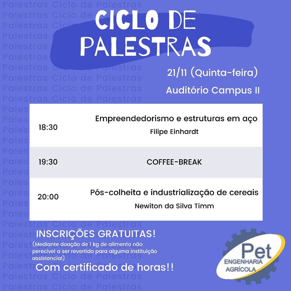 “O grupo PET Engenharia Agrícola convida a todos a prestigiar o nosso primeiro encontro do ciclo de palestras. O evento irá ocorrer no dia 21 de Novembro de 2019 (QUINTA-FEIRA), no auditório superior do Campus II e terá inicio às 18h30min.
