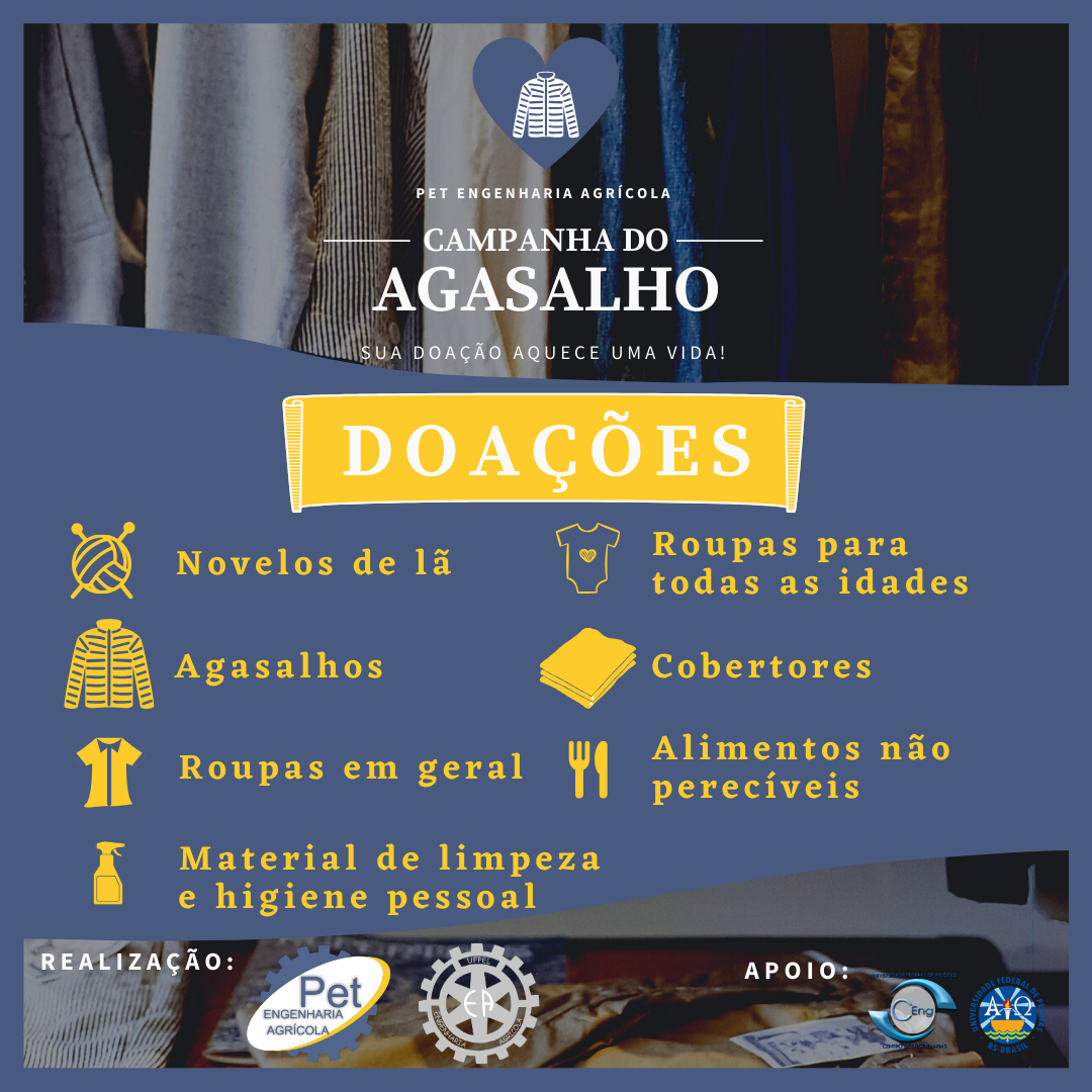 “O PET Engenharia Agrícola UFPEL, está organizando uma campanha com o intuito de auxiliar a comunidade. A campanha estará aceitando, agasalhos, sejam femininos ou masculinos e de todas as idades, roupas em geral, cobertores, novelos de lã, alimentos não perecíveis, materiais de limpeza e higiene pessoal.