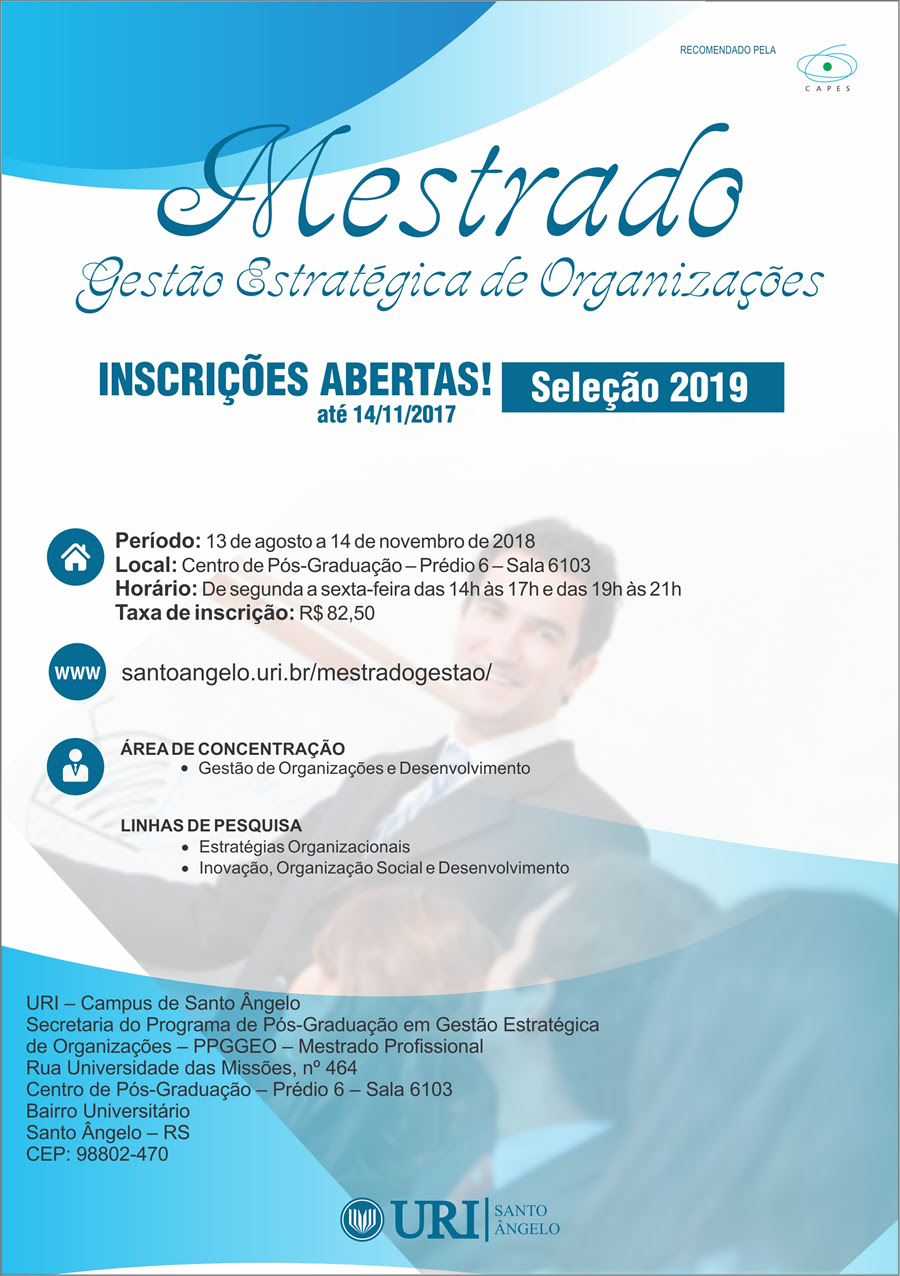 O PPGEAN possui a área de concentração “Manejo e Conservação de Ecossistemas Agrícolas e Naturais” e duas linhas de pesquisa “Ecologia de ecossistemas” e “Manejo integrado de sistemas agrícolas e florestais”. O programa é recomendado pela CAPES e credenciado na área de Ciências Agrárias I. Para este processo seletivo, e início das aulas em março/2019, estão sendo oferecidas 17 vagas. O prazo para inscrição será de 01/11 a 21/12 de 2018 (seleção fevereiro de 2019). Distintas áreas de formação podem se candidatar a uma vaga. É importante considerar que candidatos residentes fora do Estado de Santa Catarina, ou até em outros países, poderão realizar todas as fases do processo seletivo a distância pela internet. O edital, e mais informações sobre o processo seletivo, podem ser encontradas em http://ppgean.ufsc.br/. E nas redes sociais twitter.com/ppgean, facebook.com/ppgean, instagram.com/ppgean.ufsc/.
