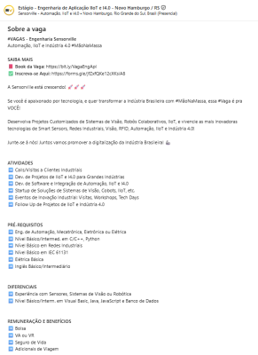 A empresa Sensorville está com uma oportunidade de estágipara a vaga de Estagiário de Engenharia.o disponível para sua unidade de Novo Hamburgo – RS. Clique abaixo para saber maiores detalhamentos para a vaga de Estagiário de Engenharia.
