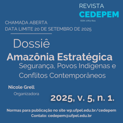 A Revista CEDEPEM convida pesquisadoras e pesquisadores a submeterem artigos inéditos para o dossiê temático “Amazônia Estratégica: Segurança, Povos Indígenas e Conflitos Contemporâneos”, que integrará o Volume 5, número 1, com publicação prevista para o primeiro semestre de 2025.
