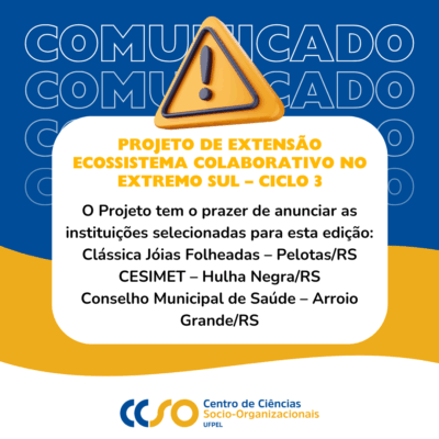 A coordenação do Projeto de Extensão Contribuições para Formação do Ecossistema Colaborativo no Extremo Sul – Ciclo 3, vinculado ao Centro de Ciências Socio-Organizacionais da Universidade Federal de Pelotas (CCSO/UFPel), torna pública a lista de organizações selecionadas para participar desta edição do projeto.