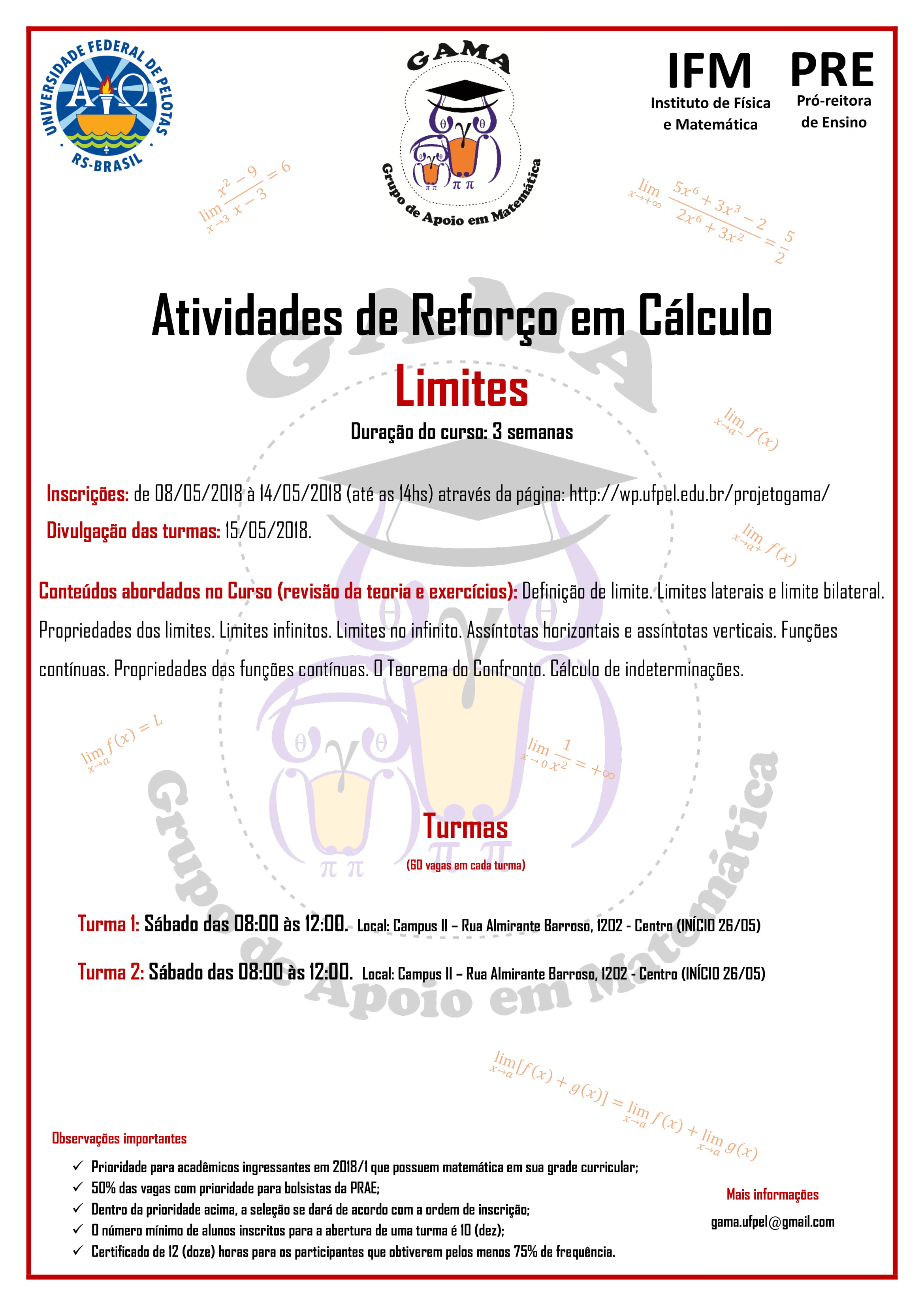 O projeto GAMA: Grupo de Apoio em Matemática, mantido em parceria com o IFM – Instituto de Física e Matemática e PRE – Pró-reitoria de Ensino, disponibilizou as inscrições para as Atividades de Reforço em Cálculo, com turmas para o Módulo de Funções Limites, Módulo de Derivadas e para o Módulo de Integrais.