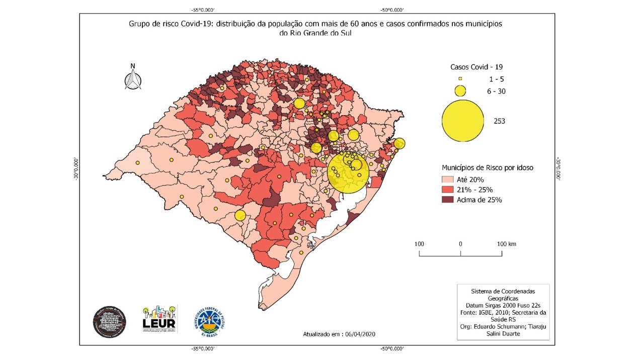 o Laboratório de Estudos Urbanos e Regionais (LEUR) realizou um mapeamento para demonstrar no estado do Rio Grande do Sul os casos confirmados de Covid-19 e sua relação com a população idosa por município. Na espacialização fica evidente que o grande centro de concentração/dispersão foi o município de Porto Alegre e região metropolitana,  devido a seu papel na estrutura urbana do estado. A expansão rápida da doença para o Município de Caxias do Sul (terceira cidade a confirmar casos de Coronavirus no estado) demonstra a formação de um eixo de integração através da malha urbana significativamente densa entre as duas Regiões Metropolitanas do RS.
