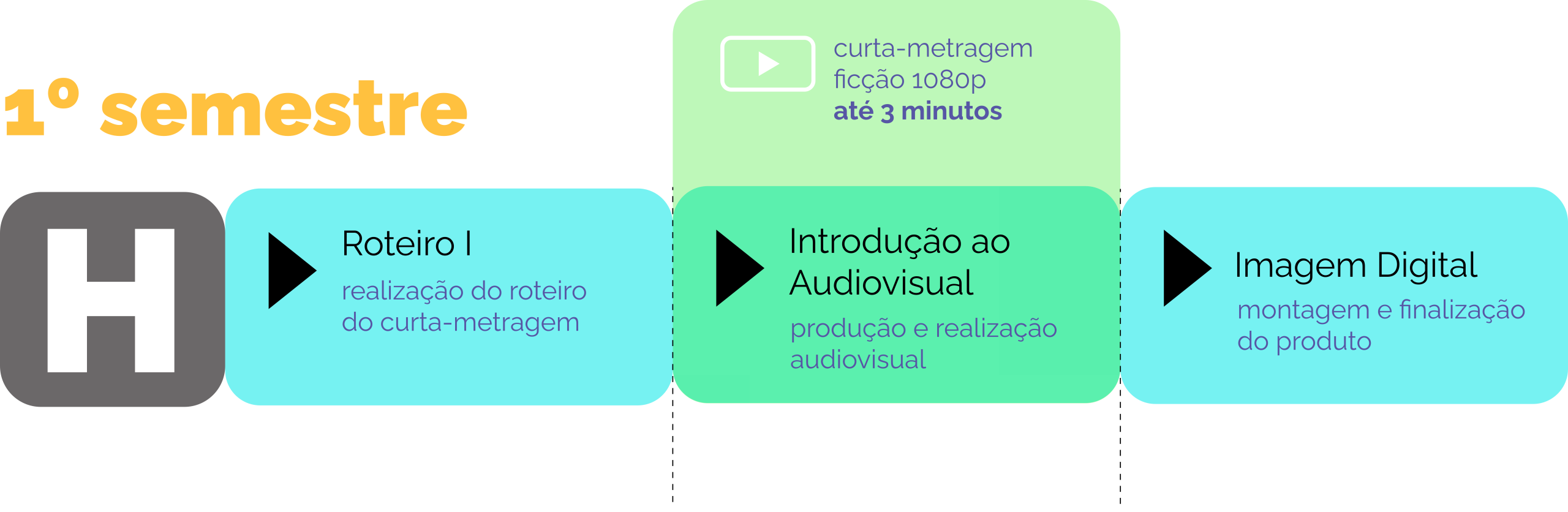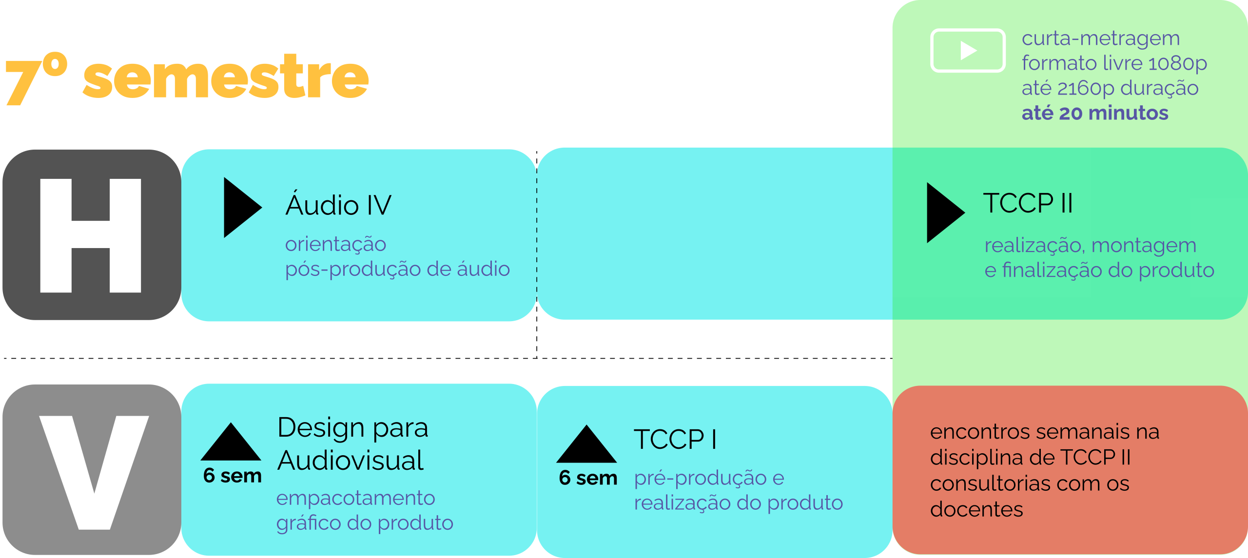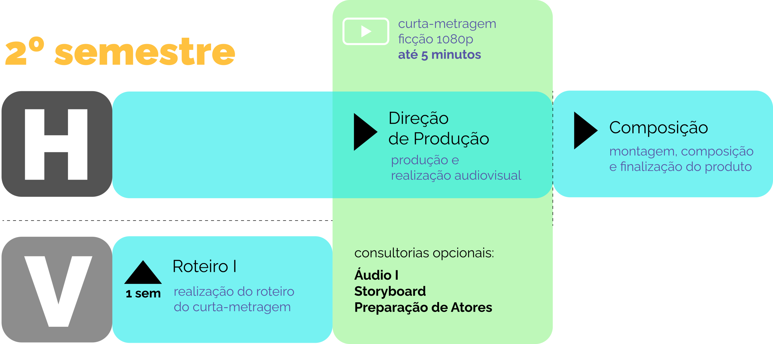 O Cinema UFPEL, desde o ano de 2013, possui um vínculo entre disciplinas de um mesmo semestre chamado de horizontalidade. A dinâmica permite o desenvolvimento de produtos audiovisuais aos estudantes ao longo da formação e racionaliza tempo e recursos concentrando o trabalho no desenvolvimento de um único projeto que pode ser semestral ou anual. Abaixo estão disponíveis os fluxos práticos da horizontalidade entre os semestres para o curso de 5010 Cinema e Audiovisual. Clique nos semestres para ver os esquemas. Observe as legendas abaixo: