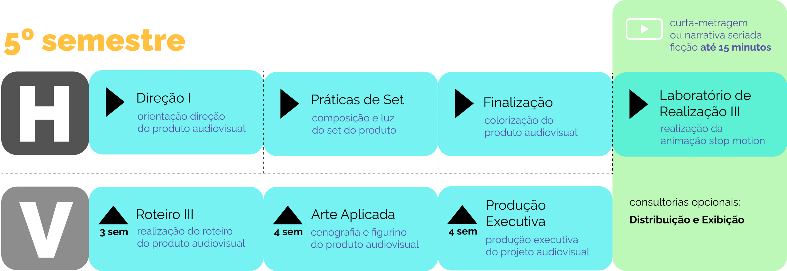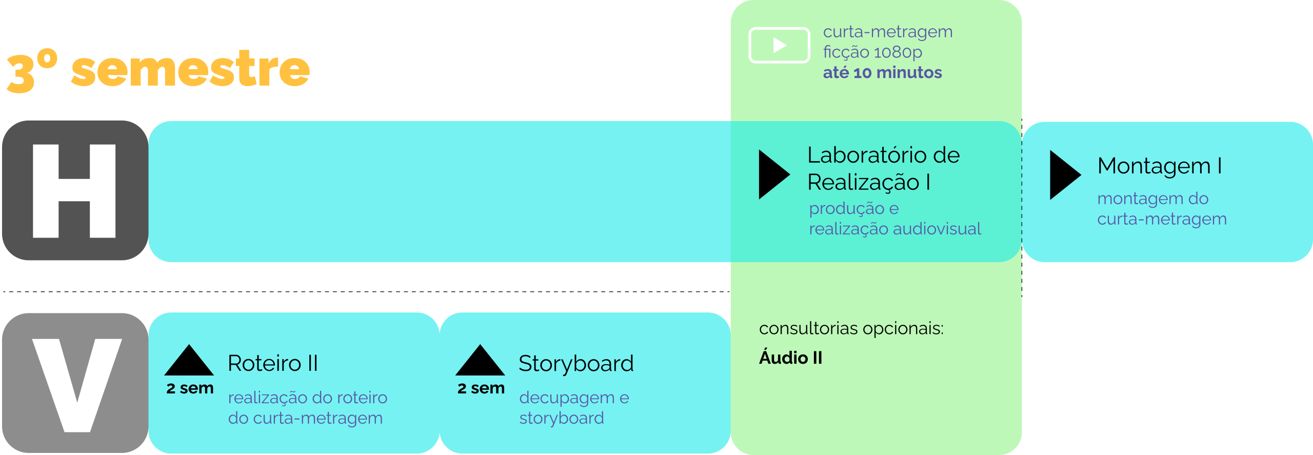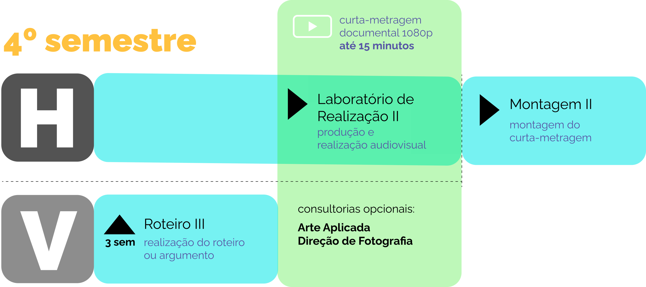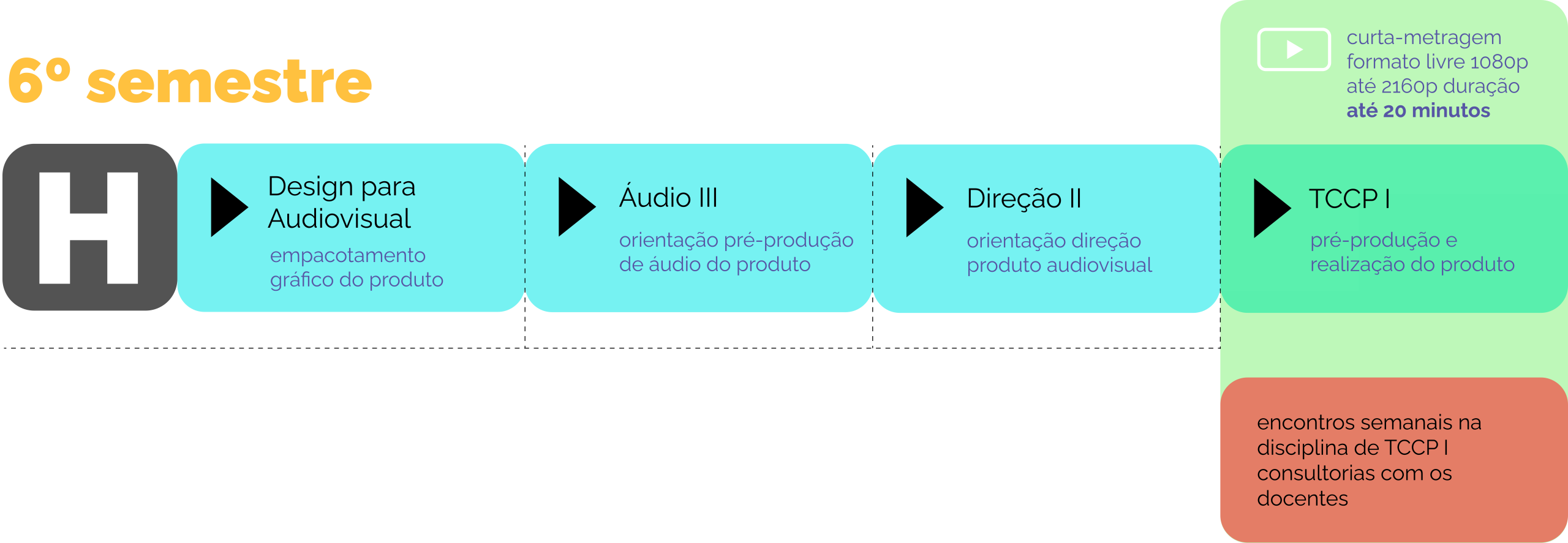 O Cinema UFPEL, desde o ano de 2013, possui um vínculo entre disciplinas de um mesmo semestre chamado de horizontalidade. A dinâmica permite o desenvolvimento de produtos audiovisuais aos estudantes ao longo da formação e racionaliza tempo e recursos concentrando o trabalho no desenvolvimento de um único projeto que pode ser semestral ou anual. Abaixo estão disponíveis os fluxos práticos da horizontalidade entre os semestres para o curso de 5010 Cinema e Audiovisual. Clique nos semestres para ver os esquemas. Observe as legendas abaixo:
