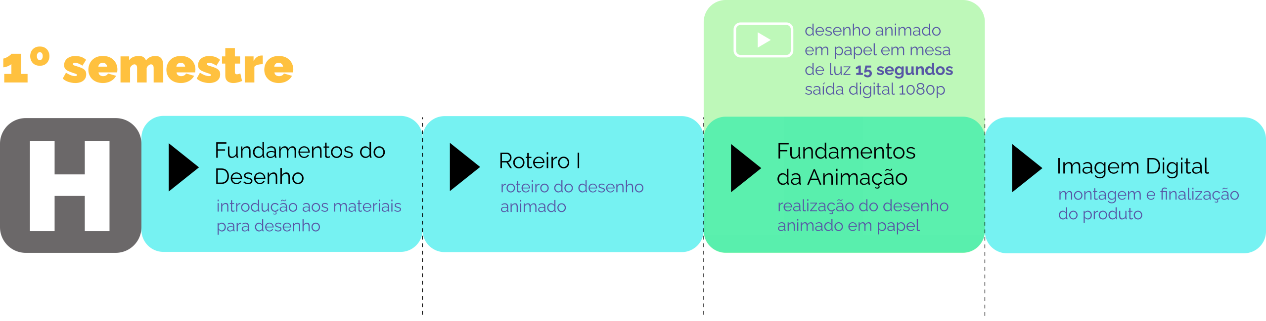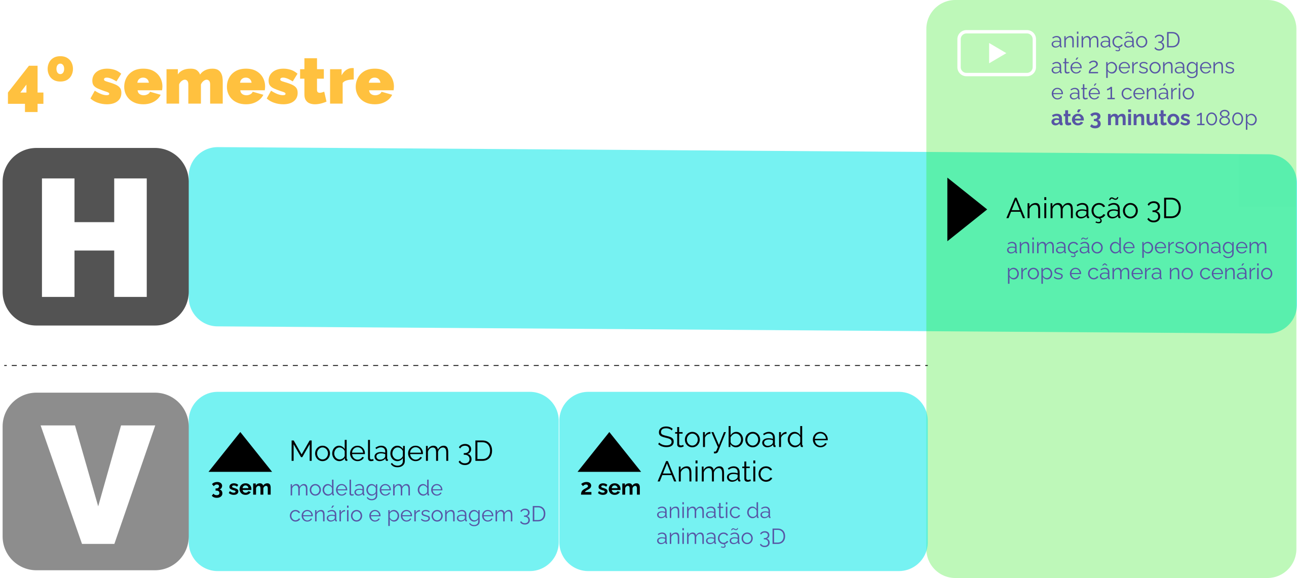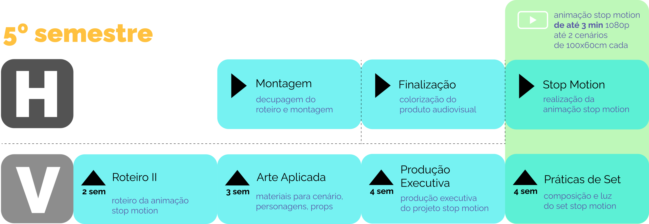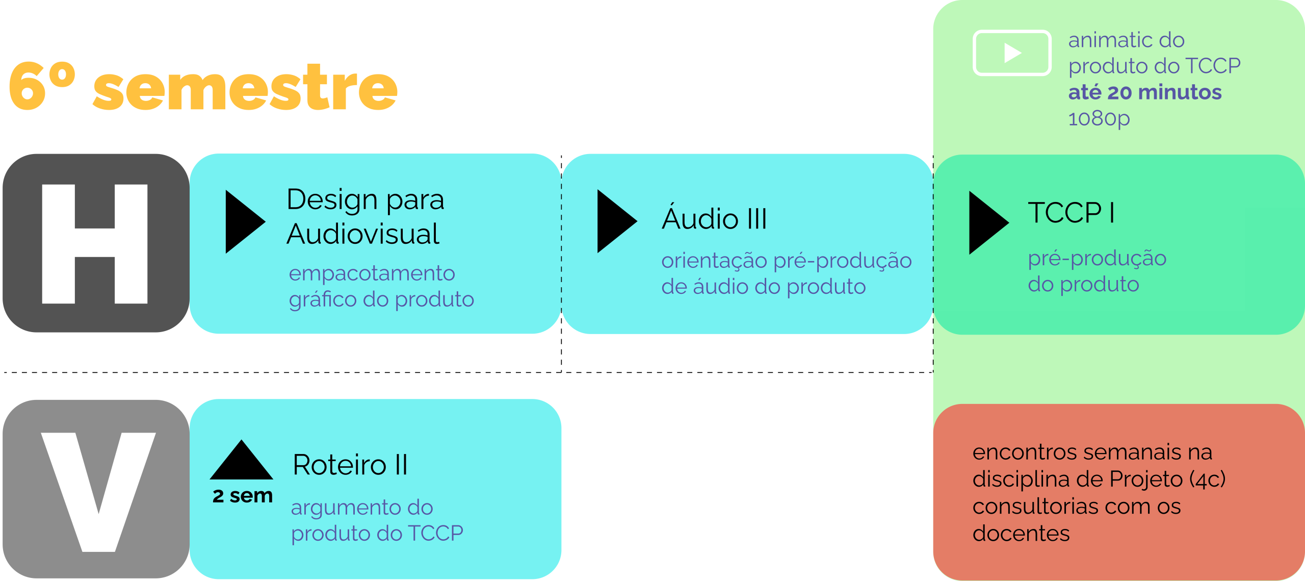 O Cinema UFPEL, desde o ano de 2013, possui um vínculo entre disciplinas de um mesmo semestre chamado de horizontalidade. A dinâmica permite o desenvolvimento de produtos audiovisuais aos estudantes ao longo da formação e racionaliza tempo e recursos concentrando o trabalho no desenvolvimento de um único projeto que pode ser semestral ou anual. Abaixo estão disponíveis os fluxos práticos da horizontalidade entre os semestres para o curso de 5020 Cinema de Animação. Clique nos semestres para ver os esquemas. Observe as legendas abaixo: