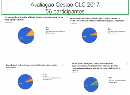 Nela estão os resultados da avaliação da Gestão CLC 2017, os quais darão embasamento para melhorias no Centro. Também consta a Distribuição Orçamentária de 2018, com a descrição dos recursos que deverão ser utilizados para qualificar o espaço da Unidade e promover eventos. Ainda foi informado que o planejamento do uso da verba dos Colegiados deve ser encaminhado à Direção até o dia 15 de maio.