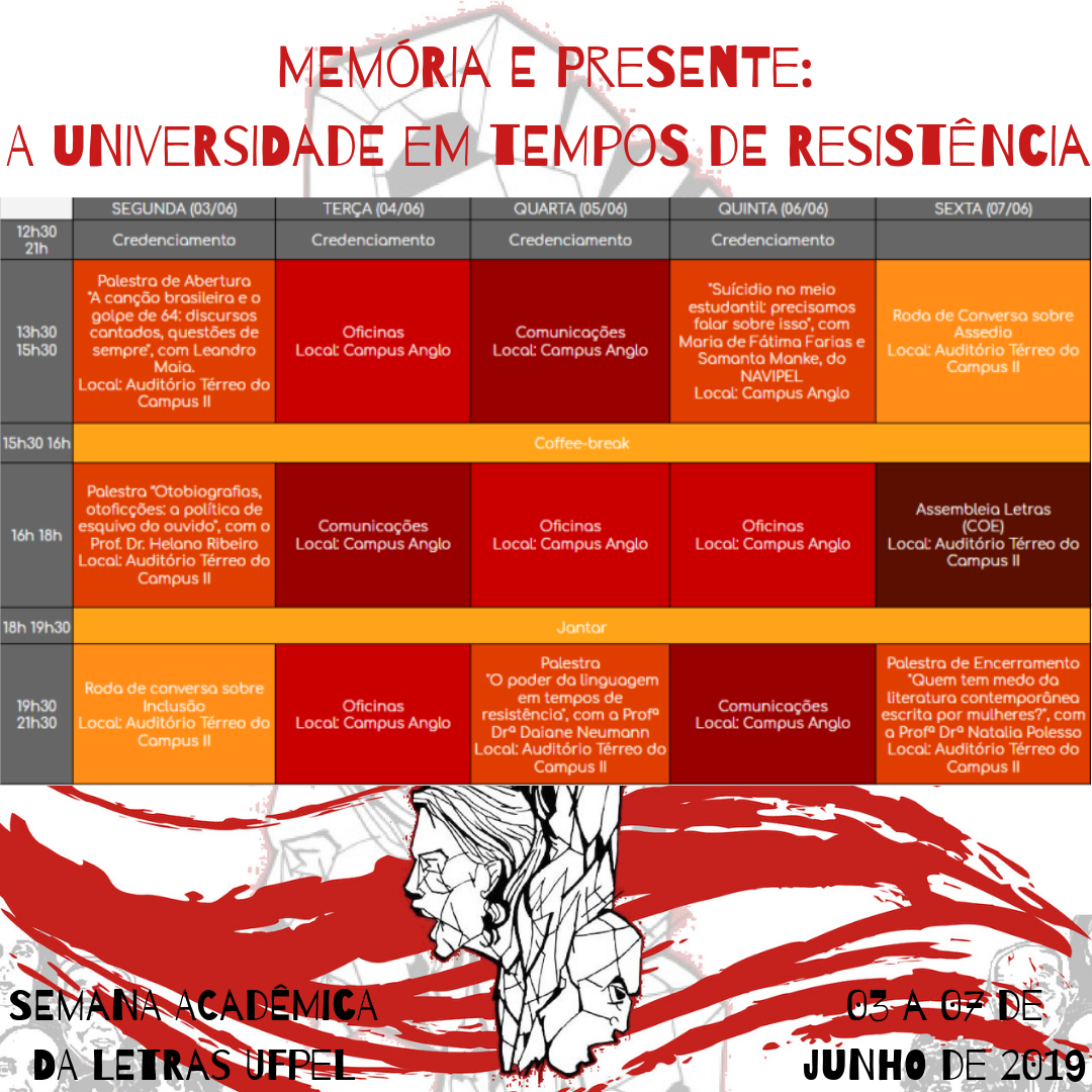 A 35ª Semana Acadêmica da Letras ocorrerá às tardes e noites da semana de 3 a 7 de junho de 2019, com palestras, rodas de conversas, comunicações, oficinas, coffee breaks, apresentações e muita integração. Acesse o site e saiba mais: https://salufpel.wordpress.com/programacao/