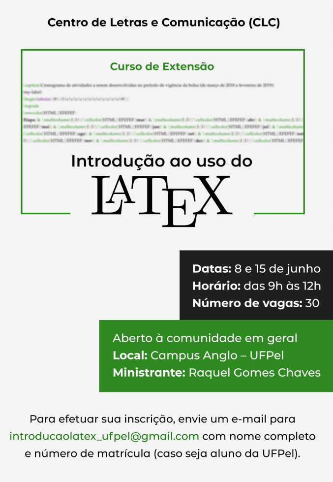 As inscrições podem ser efetuadas pelo e-mail: introducaolatexufpel@gmail.com (enviar nome completo e nº de matrícula, caso seja aluno da UFPel).