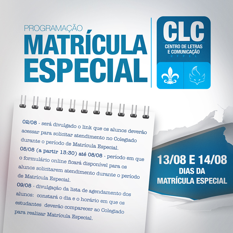 O Centro de Letras e Comunicação divulga os procedimentos e datas para a matrícula especial em 2019/2. O link para os alunos solicitarem o atendimento será divulgado no site do CLC no dia 2 de agosto.