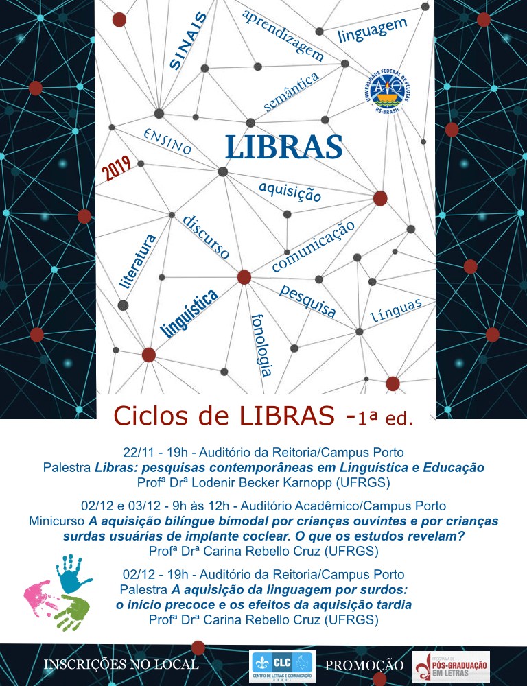 O Ciclo de LIBRAS terá a participação das professoras Lodenir Becker Karnopp e Carina Rebello Cruz, da Universidade Federal do Rio Grande do Sul. As inscrições são gratuitas e serão feitas no local. O evento recebe o apoio do Centro de Letras e Comunicação da UFPel.
