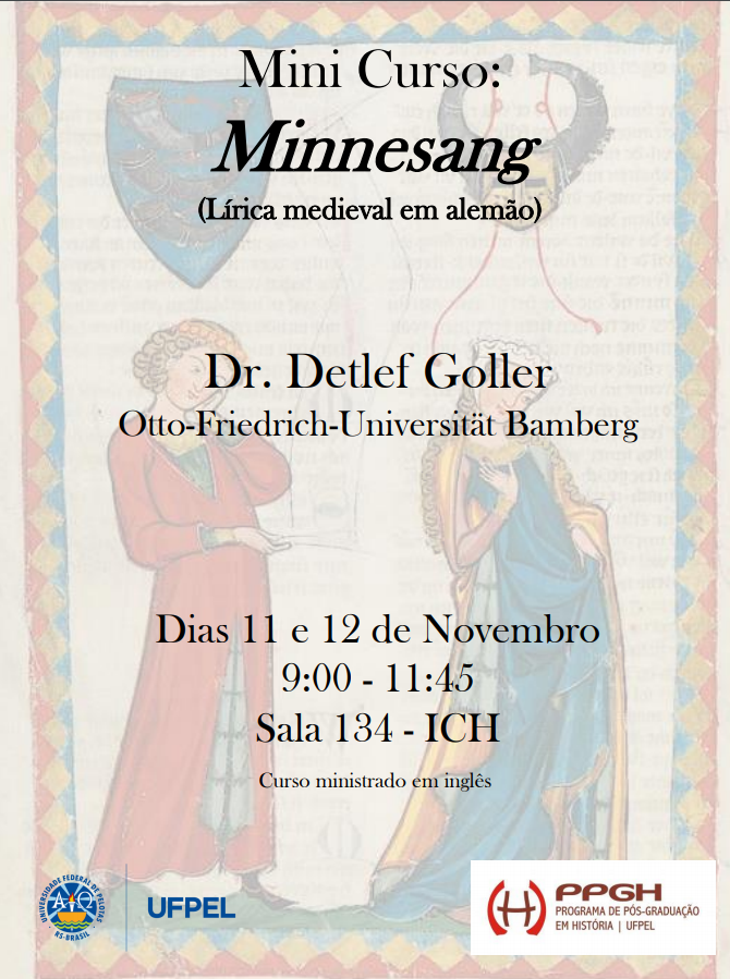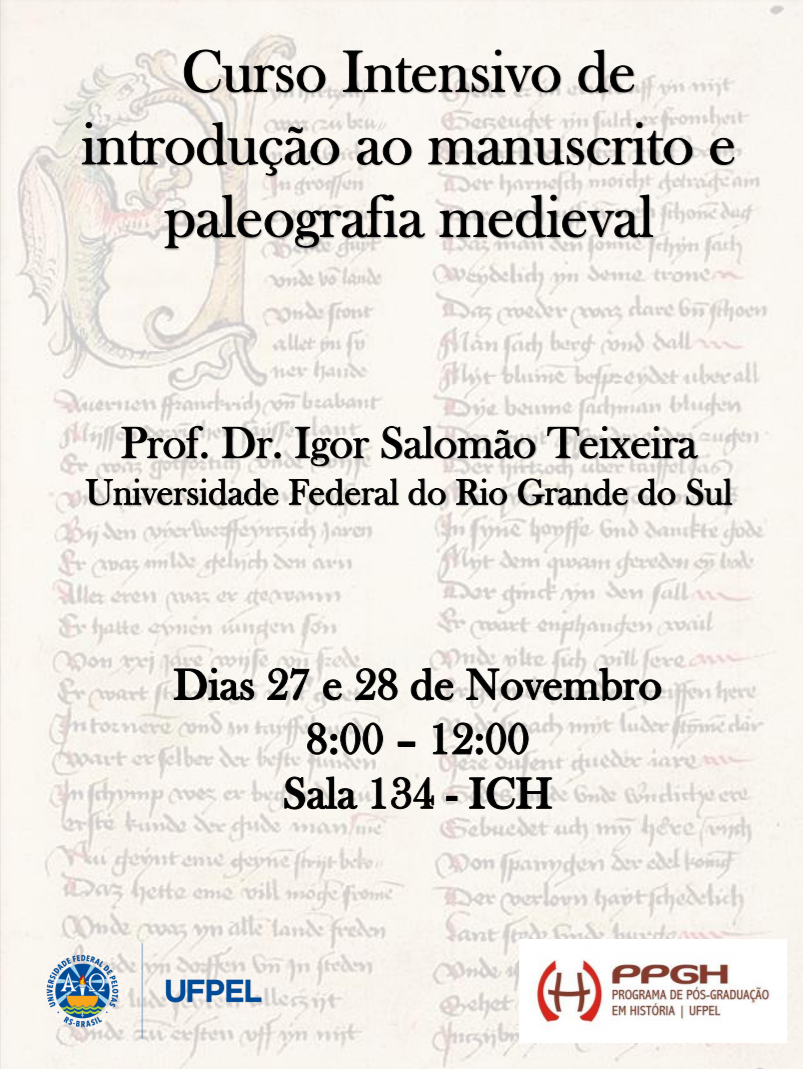 O Programa de Pós-Graduação em História da UFPel divulga cursos que acontecem no mês de novembro. O minicurso Minnesang (lírica medieval em alemão) será ministrado em inglês e ocorre nos dias 11 e 12 de novembro. Já o curso intensivo de Introdução ao manuscrito e paleografia medieval acontecerá nos dias 27 e 28.