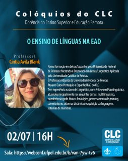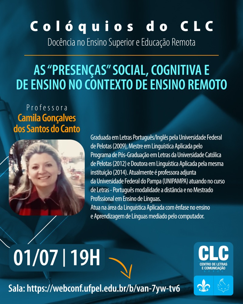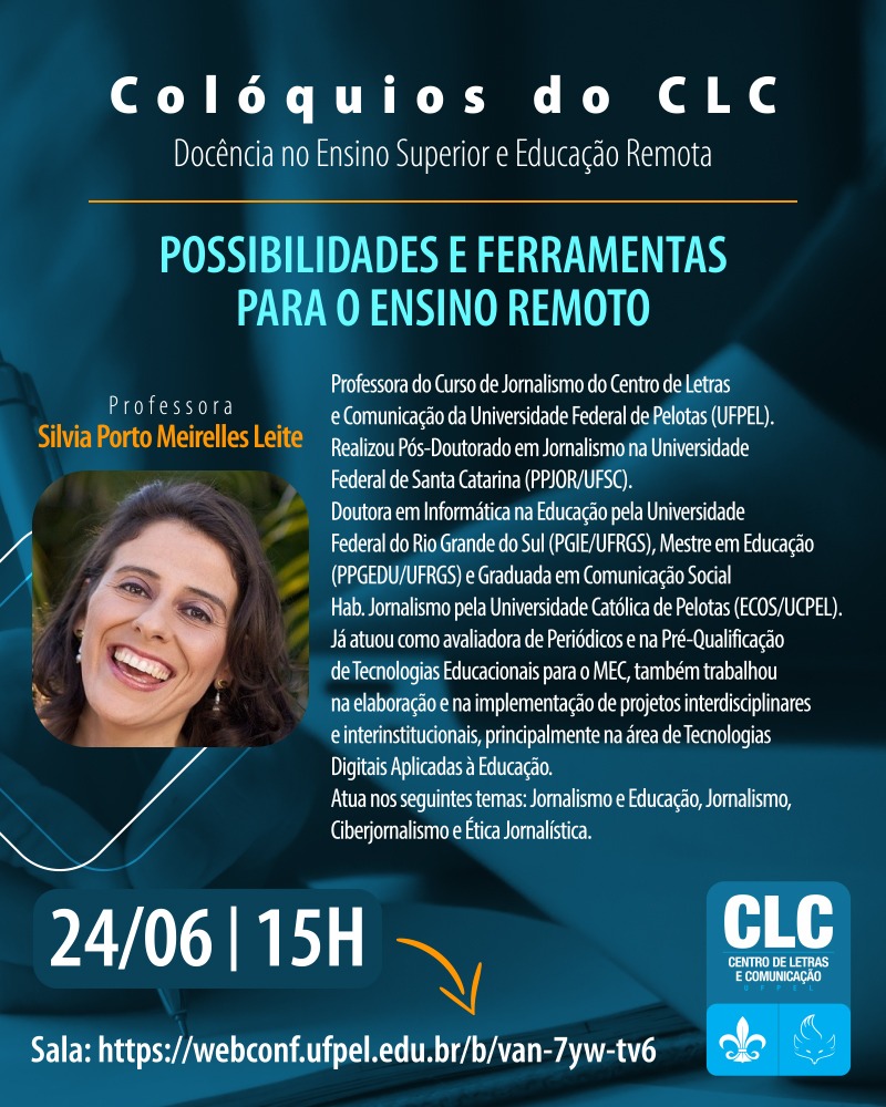 O Centro de Letras e Comunicação promove os “Colóquios do CLC: Docência no Ensino Superior e educação remota”. Nos cartazes, a programação das primeiras conversas, que acontecem nos dias 24 de junho, 1º e 2 de julho, na websala https://webconf.ufpel.edu.br/b/van-7yw-tv6