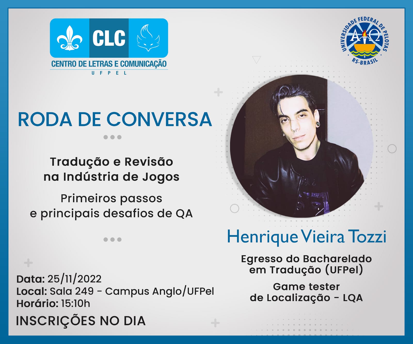 Tem duas rodas de conversa imperdíveis nesta sexta-feira, no campus Anglo: às 13h30, a Vitória Tassara estará batendo um papo sobre “Tradução audiovisual, mercado de trabalho e formação acadêmica” na sala 440. Logo em seguida, o Henrique Tozzi vai dar todas as dicas sobre “Tradução e revisão na indústria de jogos: primeiros passos e principais desafios de QA”, na sala 249. Tradutores/as formados/as pela UFPel e tradutores/as em formação estarão lá, proseando, trocando ideias, matando a saudade e falando sobre tradução para todo mundo que quiser saber mais. É só chegar!