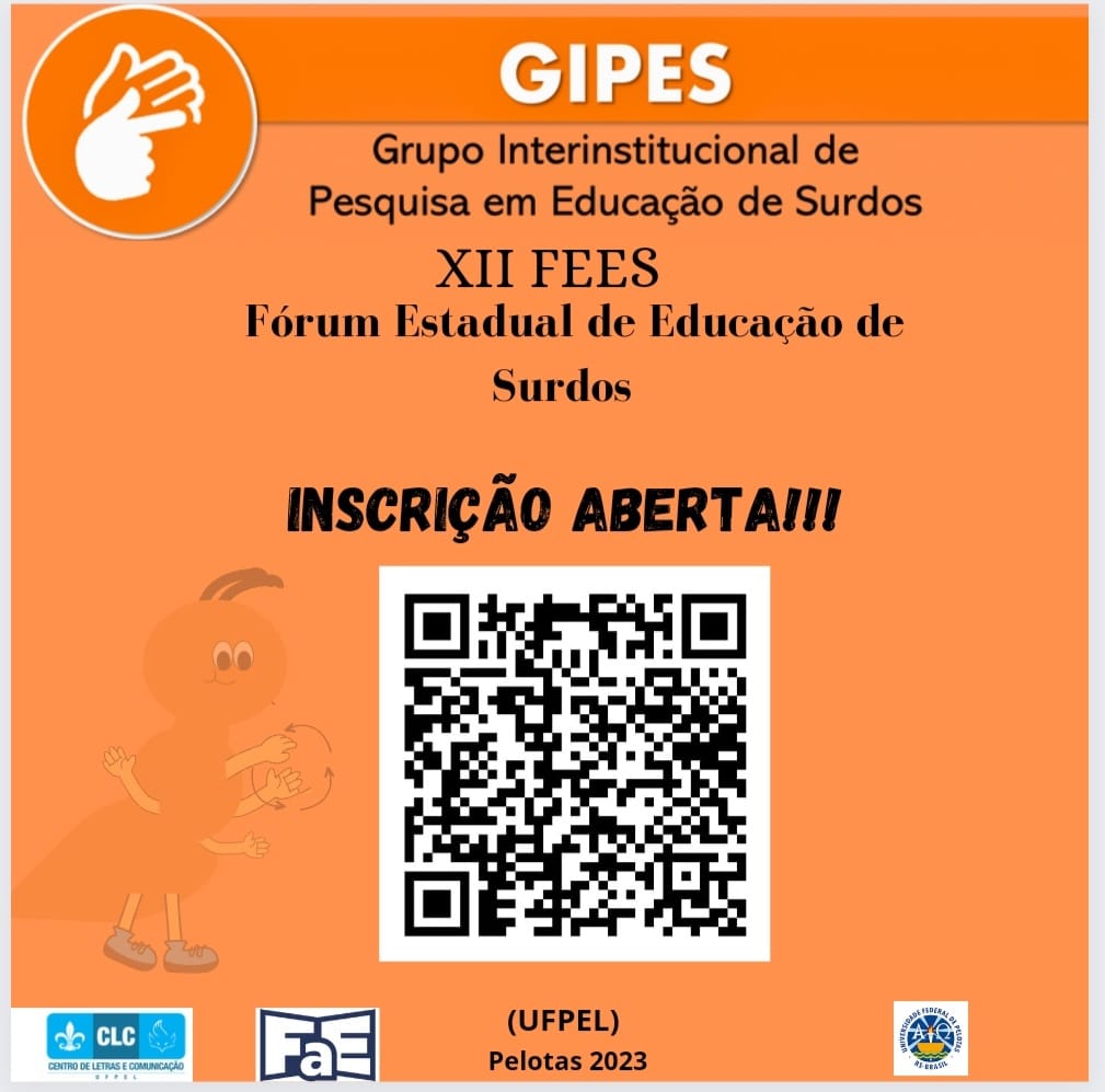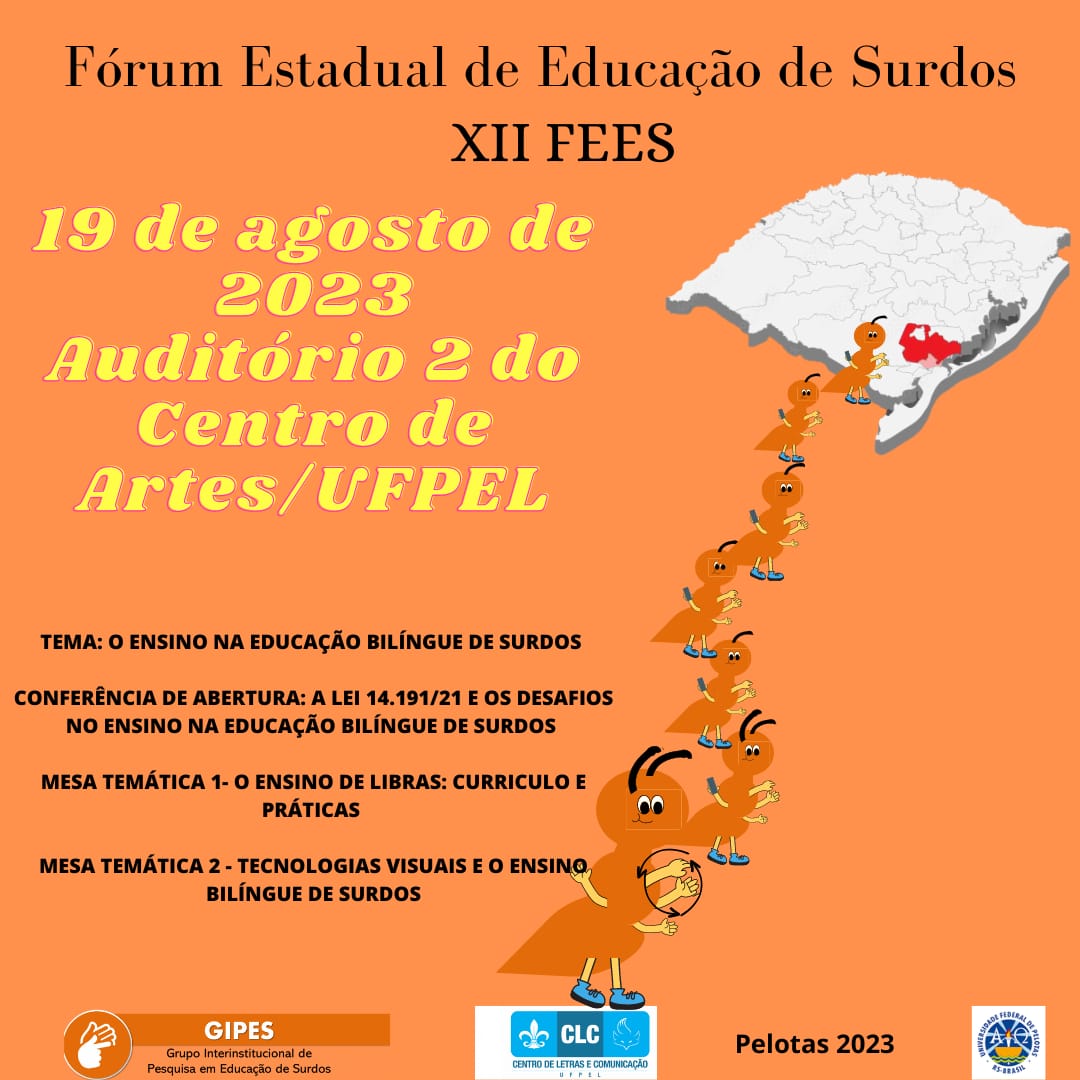 No mês de agosto ocorrerá o XII Fórum Estadual de Educação de Surdos, tendo como tema principal: “O Ensino da Educação Bilíngue de Surdos”. O evento está previsto para acontecer no dia 19 de agosto de 2023, das 9h às 18h, no Auditório 2 do Centro de Artes – UFPel. O prazo de inscrições é de 24 de julho até o dia 16 de agosto (vagas limitadas). Os inscritos podem trazer 1 KG de alimento não perecível que serão doados para a Escola Bilíngue Prof° Alfredo Dub. (Não é obrigatório).