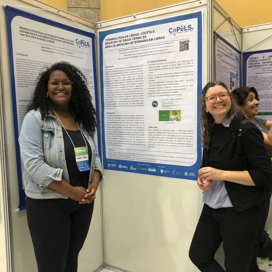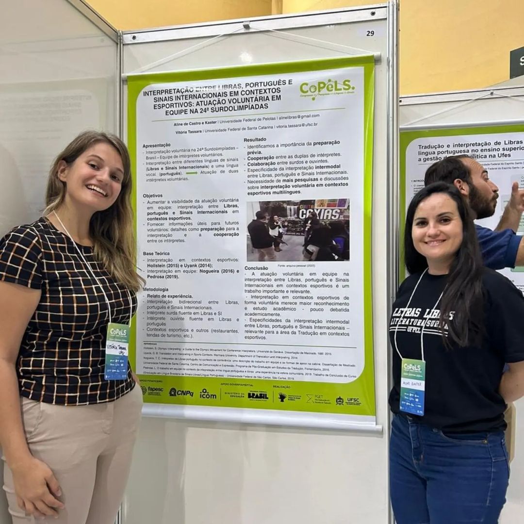 Aline Kaster, professora do Letras Libras/Literatura Surda, e Vitória Tassara, egressa do Letras – Tradução Inglês/Português, apresentaram pôster sobre sua experiência na tradução Libras, Português e Sinais Internacionais na 24ª Surdolímpiadas.