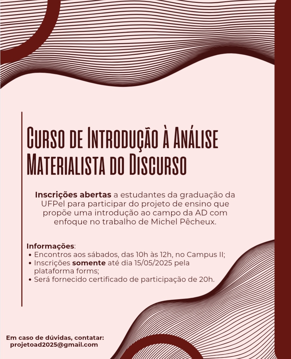 O projeto é destinado a estudantes de cursos de graduação e pós-graduação da Universidade Federal de Pelotas (UFPel) e de outras universidades. Trata-se de um projeto de ensino com carga horária de 20 horas. Durante 7 encontros, serão discutidos textos vinculados ao campo da Análise Materialista do Discurso, com enfoque no trabalho de Michel Pêcheux. O projeto é coordenado pela Profa. Dra. Janaína Brum e pela Profa. Dra. Luciana Iost Vinhas e ministrado por Jhuly Nolasco e Marina Moreira Peres da Rosa, discentes do Mestrado em Letras da UFPel. Os encontros ocorrerão presencialmente, no Campus II – Sala 305 (Rua Almirante Barroso, 1202) de forma semanal, aos sábados, das 10h às 12h, com início no dia 24/05/2025 e finalização no dia 12/07/2025. Informações sobre bibliografia serão encaminhadas diretamente aos e-mails dos inscritos.