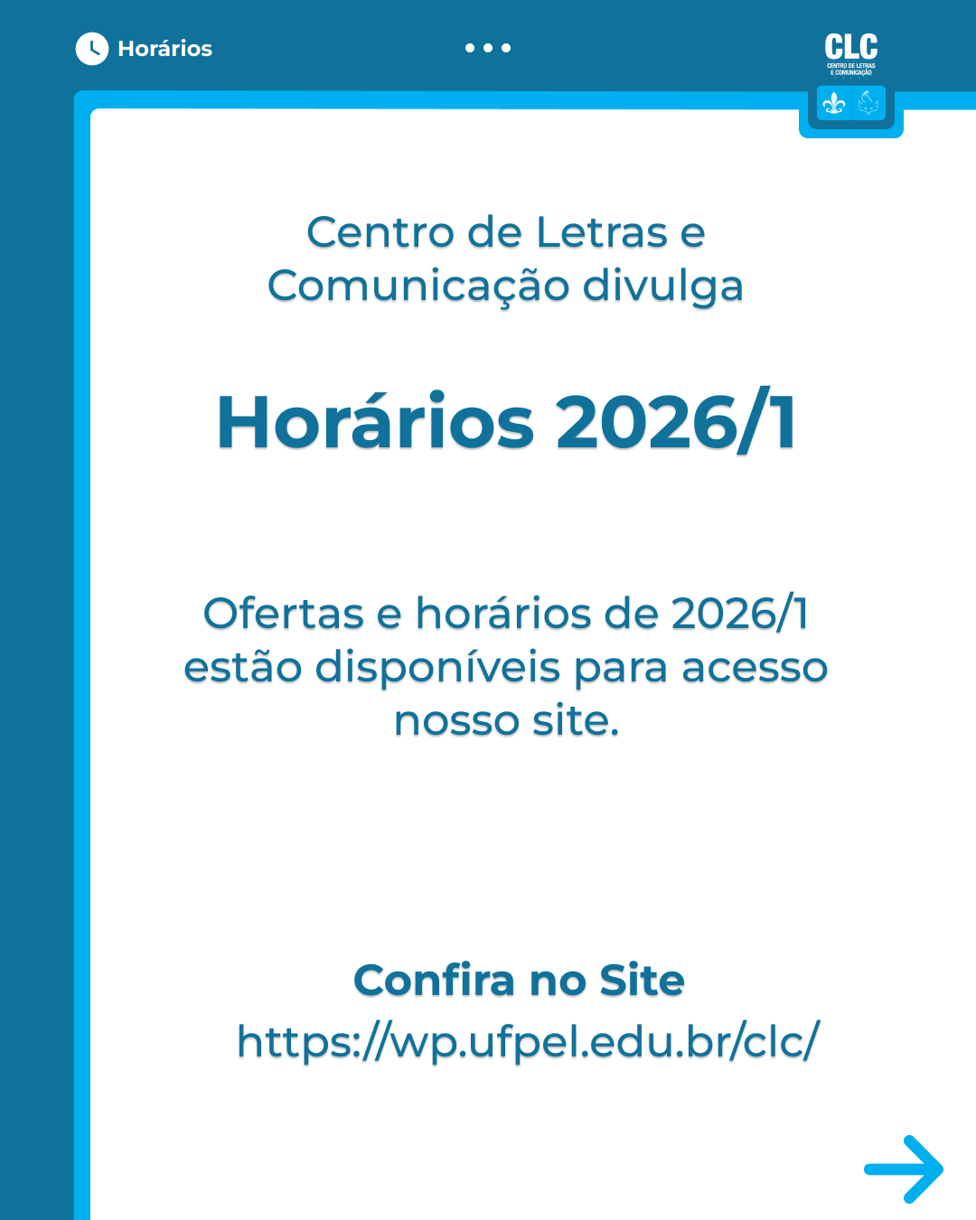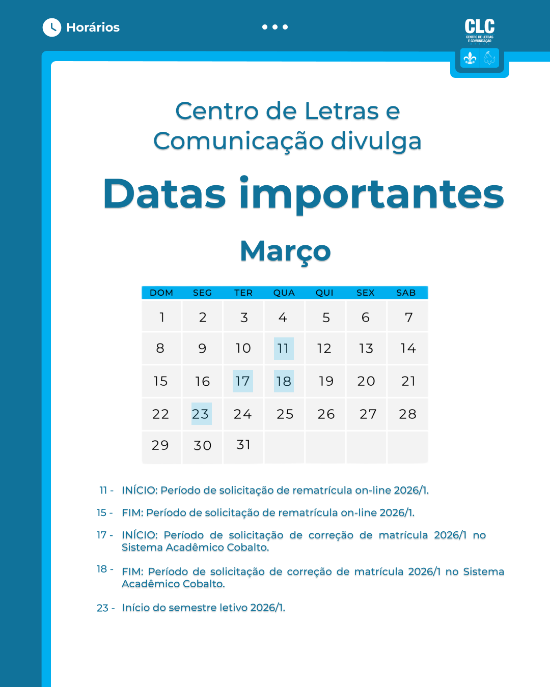 A Câmara de Ensino (CaEns) do Centro de Letras e Comunicação – UFPel divulga os horários para o semestre 2026-1. Você também pode conferir as datas importantes do mês de março.