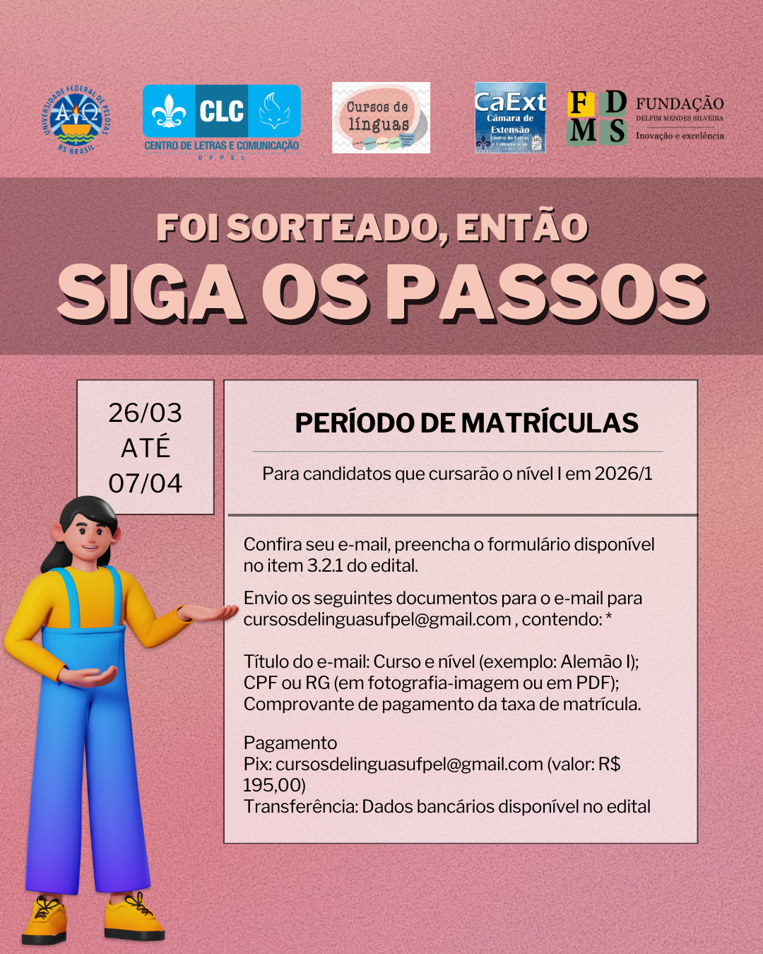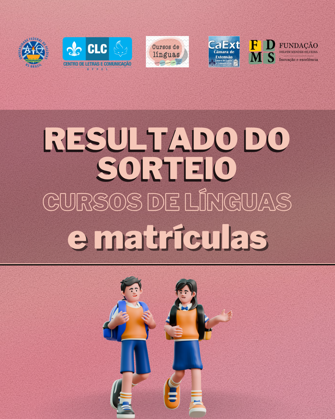 A Coordenação dos Cursos de Línguas da Câmara de Extensão do CLC/UFPel divulga a lista dos candidatos sorteados da comunidade e de servidores da UFPel para matrícula nos cursos de 2026/1.