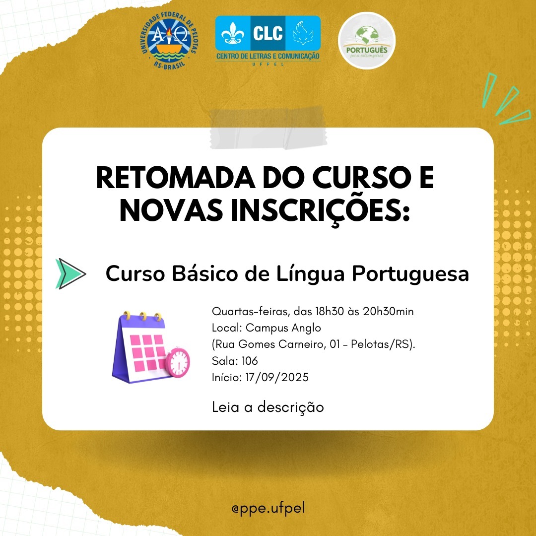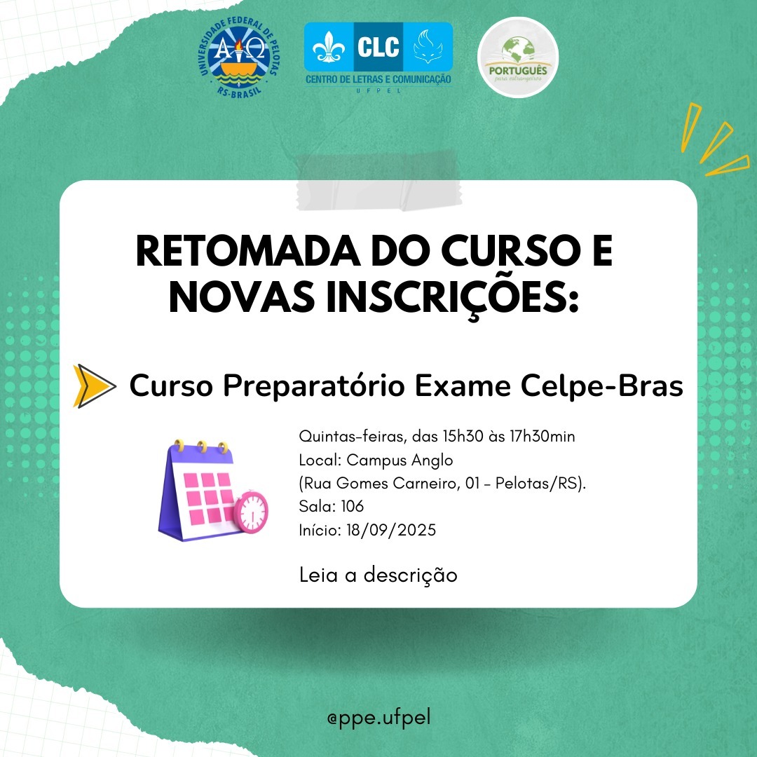 A Coordenação do projeto Cursos de Línguas da Câmara de Extensão do Centro de Letras e Comunicação (CLC) da UFPel divulga a lista dos candidatos sorteados da comunidade em geral e servidores da UFPel, os quais podem realizar sua matrícula para os cursos em 2025/5.