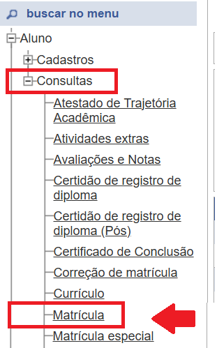 I- Após o período de processamento das matrículas, o discente poderá consultar se sua matrícula foi efetivada. Acesse o Menu, em Consultas e depois Matrícula: