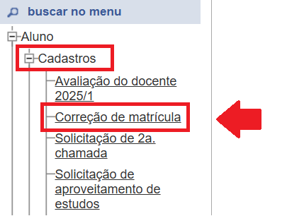 I- No período definido no calendário acadêmico,, o discente acessa no Menu Cadastro, em Correção de Matrícula: