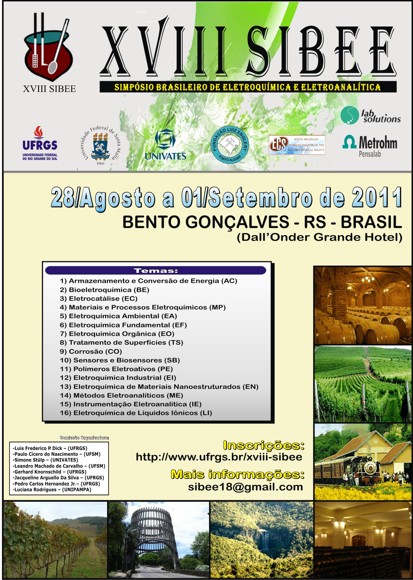 O XVIII SIBEE e a comissão organizadora do XVIII Simpósio Brasileiro de Eletroquímica e Eletroanalítica tem a honra de convidá-lo a participar desse evento que ocorrerá no centro de convenções do Hotel Dall’Onder na cidade de Bento Gonçalves, Rio Grande do Sul, Brasil no período de 28 de agosto a 01 setembro 2011.