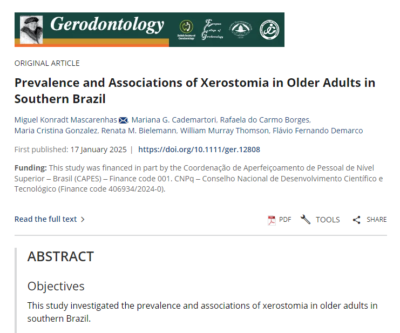 Foi publicado recentemente, no periódico científico Gerodontology, o artigo intitulado Prevalence and Associations of Xerostomia in Older Adults in Southern Brazil, resultado da dissertação de mestrado de Miguel Konradt Mascarenhas, membro da equipe do estudo “COMO VAI?”. O trabalho contou ainda com a colaboração de outros pesquisadores vinculados à Universidade Federal de Pelotas – UFPel e à Universidade de Otago, em Dunedin, Nova Zelândia.