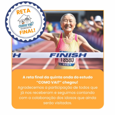 A quinta onda do estudo “COMO VAI?” está chegando ao fim! 570 idosos já participaram das entrevistas domiciliares realizadas até o momento, e a equipe agradece imensamente a todos que contribuíram com essa importante etapa da pesquisa.
