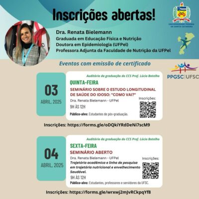 Atenção, estudantes da UFSC: Participe! Essa é uma oportunidade única para conhecer mais sobre estudos longitudinais em saúde da população idosa, discutir trajetórias acadêmicas e refletir sobre o envelhecimento saudável no Brasil. Seguimos firmes na construção de uma ciência comprometida, transformadora e conectada com os desafios do presente e do futuro.